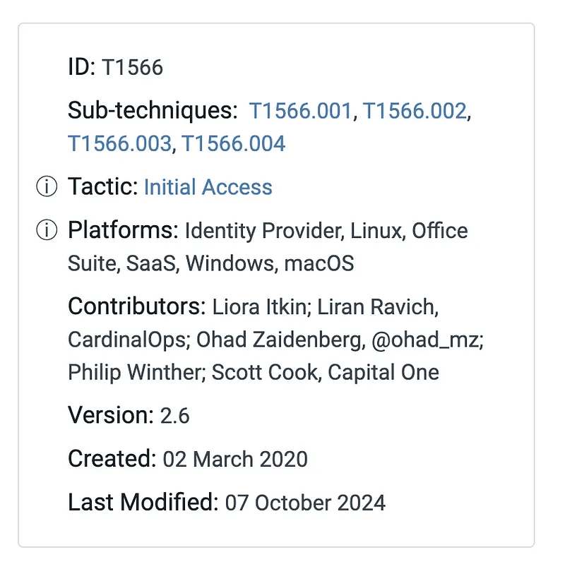 From the details, I learned that MITRE categorizes this under the Initial Access tactic and lists subtechniques such as: