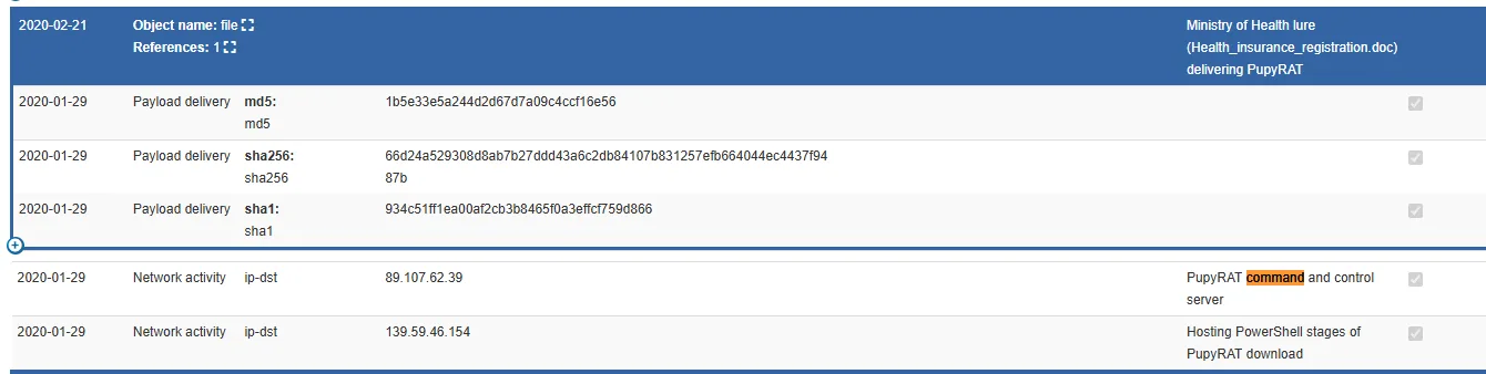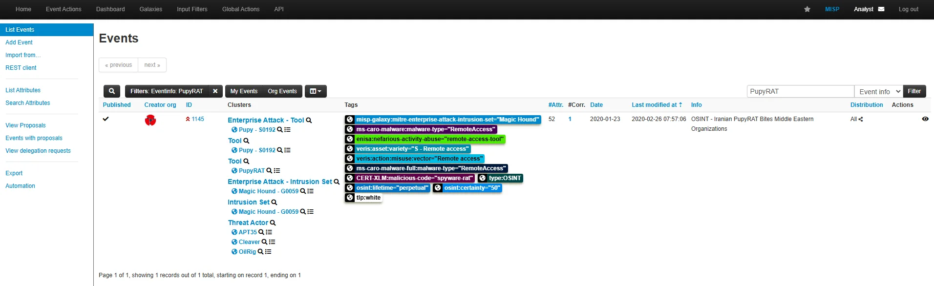 MISP quickly retrieved an existing event titled “PupyRAT event.”