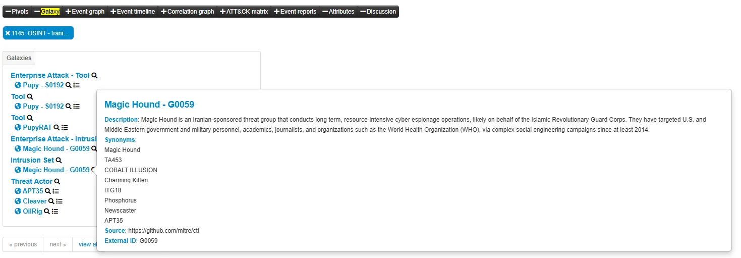 Under the Galaxy view, I checked the related Intrusion Set and discovered that the campaign was linked to the Magic Hound group — a known threat actor.
