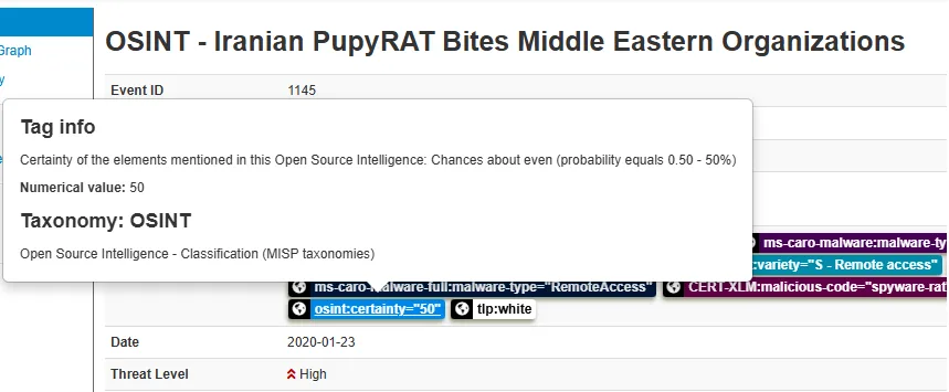 Finally, under the taxonomy section, I spotted a tag named osint:certainty=”50”, meaning this information had a 50% confidence level based on open-source intelligence.