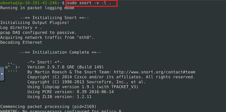 I started Snort in verbose sniffer mode to capture live packets: sudo snort -v -l .