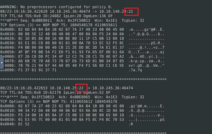 I filtered for port 22 traffic: sudo snort -r snort.log.1672414629 -X | grep β:22β