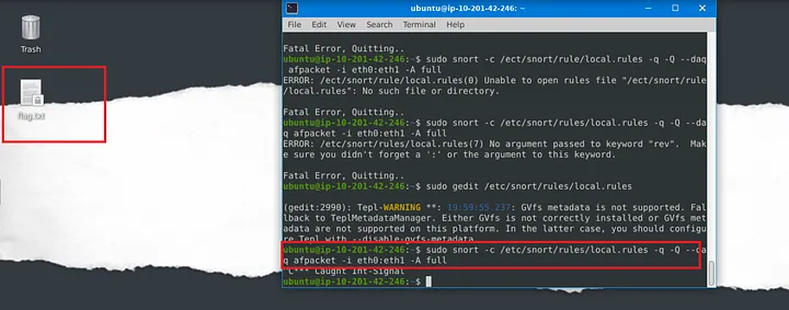I edited local rules again: sudo gedit /etc/snort/rules/local.rules