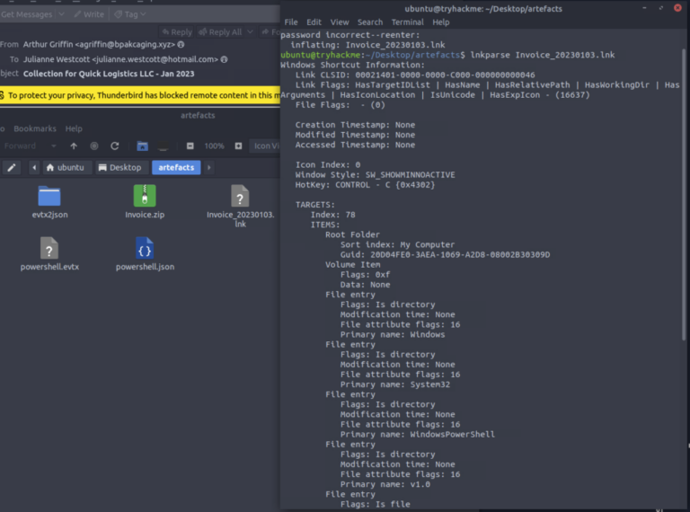 /home/ubuntu/Desktop/artefacts dump.eml (phishing email) Invoice.zip → Invoice_20230103.lnk powershell.json (PowerShell logs) capture.pcapng (packet capture)