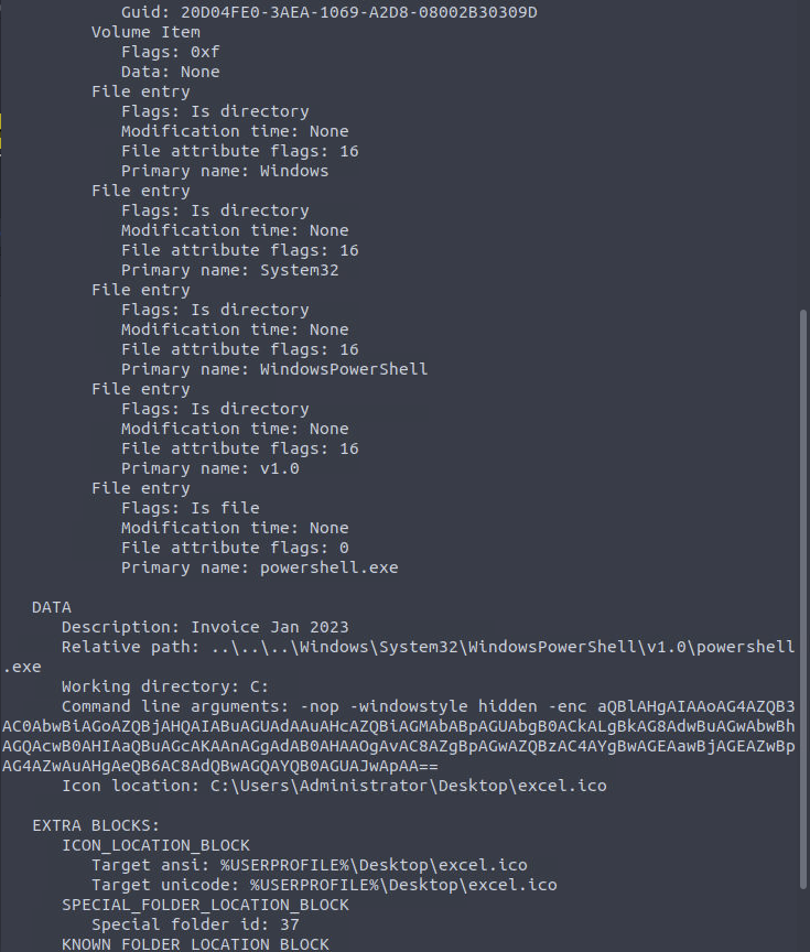 - lnkparse Invoice_20230103.lnk → found base64-like payload (UTF-16LE encoded PowerShell IEX command).