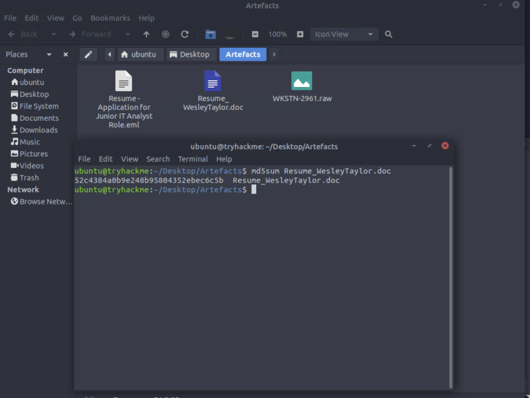 /home/ubuntu/Desktop/Artefacts Resume_WesleyTaylor.doc (malicious DOC) — MD5 52c4384a0b9e248b95804352ebec6c5b memorydump.raw (memory image)