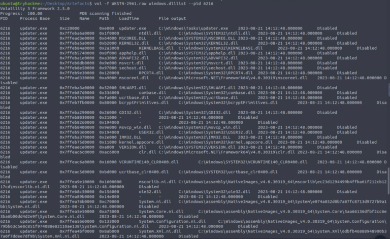 - updater.exe spawns and establishes C2: PID used to establish C2: 6216 / Path of malicious process: C:\Windows\Tasks\updater.exe / C2 IP:port: 128.199.95.189:8080 (observed in netscan / network artifacts)