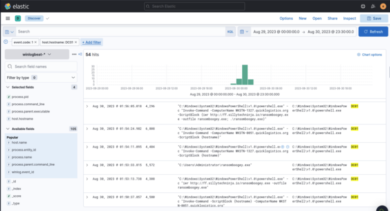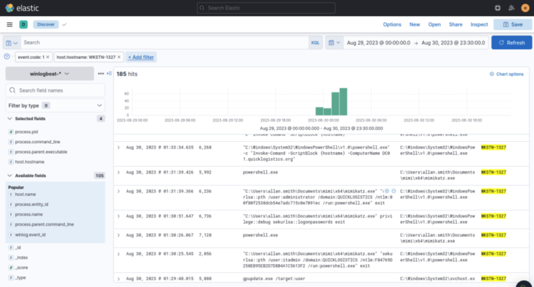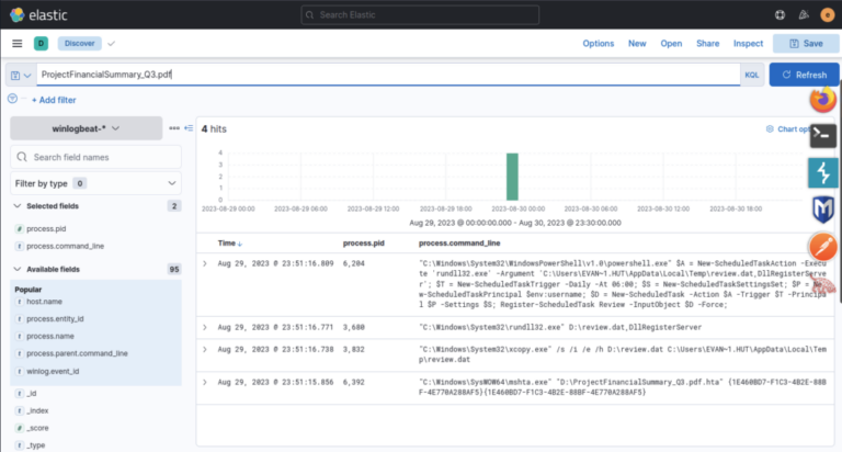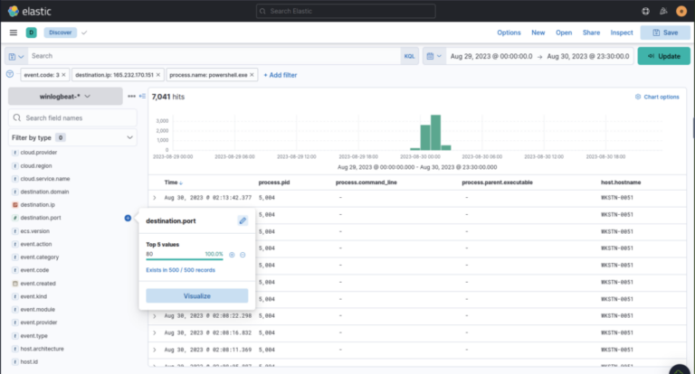 Log into Kibana (Discover). Set date range to Aug 29–30, 2023. Add relevant fields to the Discover view: process_name, process_command_line, event_id, destination.ip, destination.port, user, host.name, parent_process_name, pid.