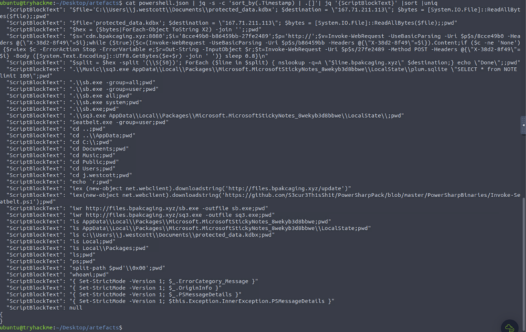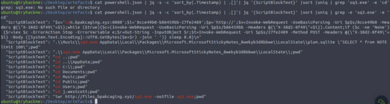 cat powershell.json jq . and targeted queries for .ScriptBlockText. - Discovered download/command domains: cdn.bpakcaging.xyz / files.bpakcaging.xyz