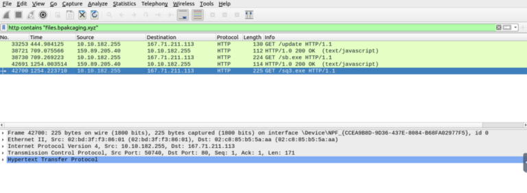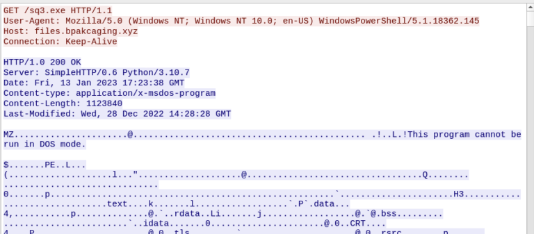 - Search for network connections from the implanted binary; found HTTP traffic to: