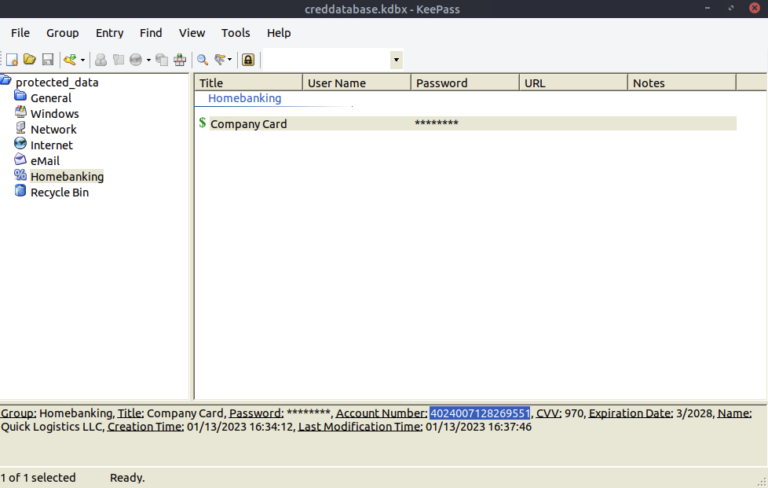 - Exfiltrated file name: protected_data.kdbx (KeePass DB)