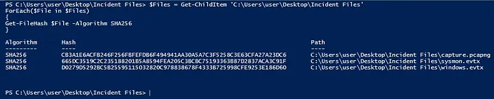 $Files = Get-ChildItem ‘C:\Users\user\Desktop\Incident Files’ ForEach($File in $Files) { Get-FileHash $File -Algorithm SHA256 }