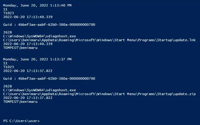 - C:\Users\benimaru\AppData\Roaming\Microsoft\Windows\Start Menu\Programs\Startup\update.lnk On user login, it executed a PowerShell command to download and run first.exe: