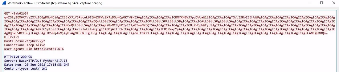 - /9ab62b5? using the HTTP GET method. The User-Agent header indicated the payload was written in Nim.